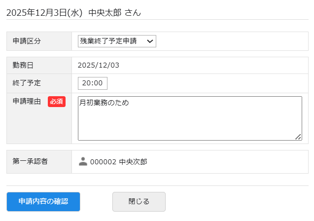 - 残業終了の予定時刻を申請をし、その後実績申請をしたい