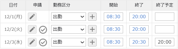 承認されることで、勤務表上に「終了」と「予定終了時刻」を並べることができます。