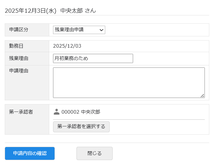 - 時間外は打刻通り自動集計するが、残業理由を申請させたい