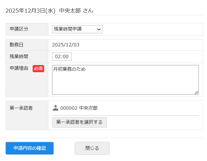 カスタム項目(時間形式)を用いて、残業時間(02:00)を申請させます。